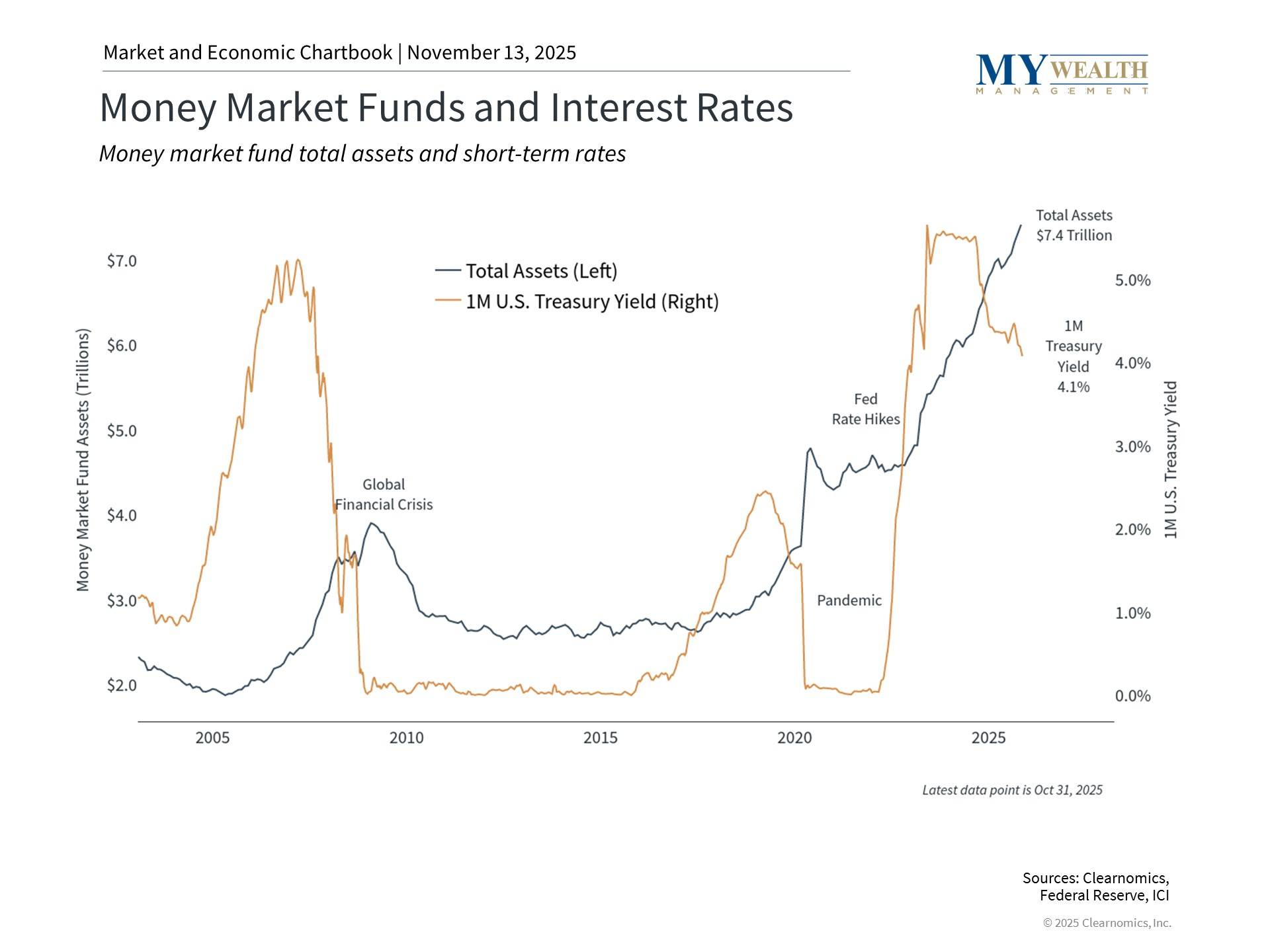 For many long-term investors, one of today’s growing challenges is deciding what to do with cash as short-term interest rates begin to fall. Keeping extra cash on the sidelines can feel safe, especially after a few years of high rates and market uncertainty. But what feels “risk-free” can quietly work against you over time, limiting your ability to grow your wealth and stay ahead of inflation. Right now, investors are holding a record $7.3 trillion in money market funds, the highest level ever recorded. The question is: how much of that cash is helping long-term goals, and how much is actually holding them back? The role of cash in your planCash absolutely has a place in every financial plan. It provides flexibility, stability, and immediate access when you need it most. That includes: